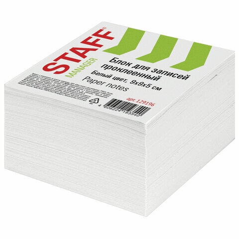 Блок для записей STAFF проклеенный, куб 9х9х5 см, белый, белизна 90-92%, 129196