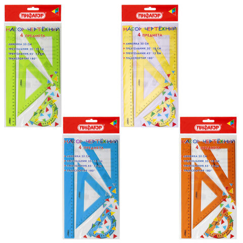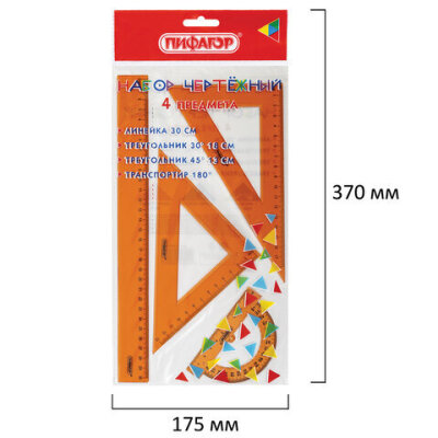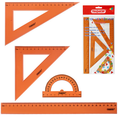 | Комплектация | большой треугольник, линейка, малый треугольник, транспортир |