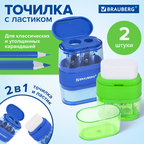 Точилки с ластиком 2 в 1 BRAUBERG "Double", НАБОР 2 ШТУКИ, 2 отверстия, синяя и зеленая, блистер, 271995