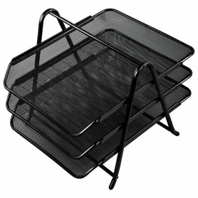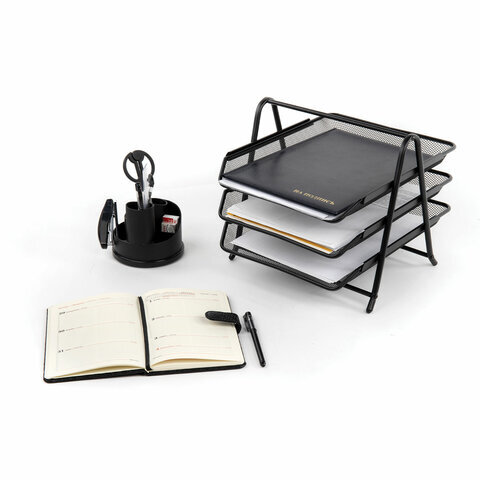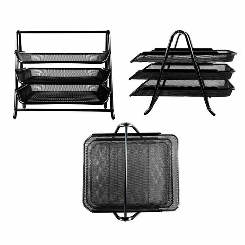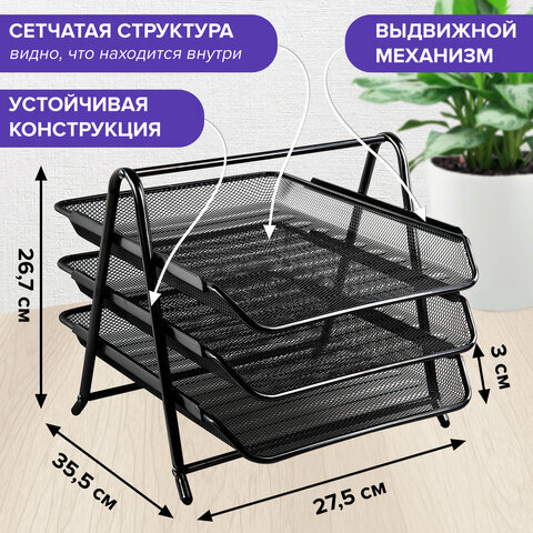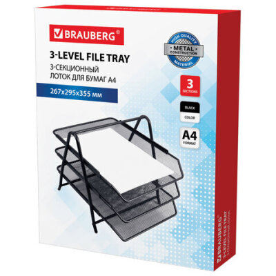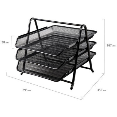 Лоток горизонтальный металлический для бумаг, 3 секции, BRAUBERG "Germanium", А4 (267х355х295 мм), черный, 231952
