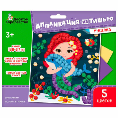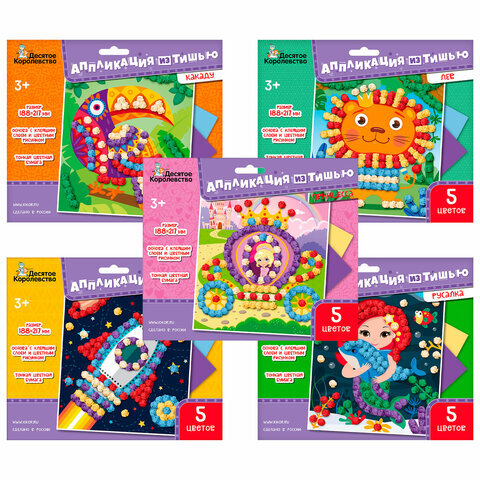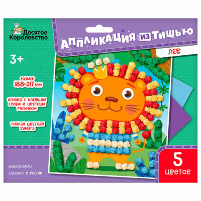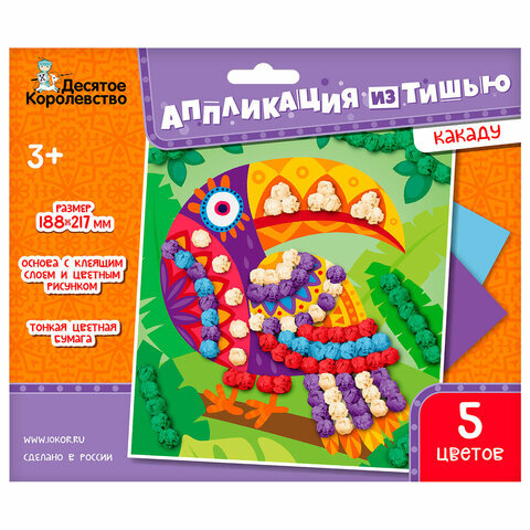 • Набор для детского творчества "Аппликация из тишью" состоит из цветной карточки с ярким изображением и листов цветной бумаги тишью.