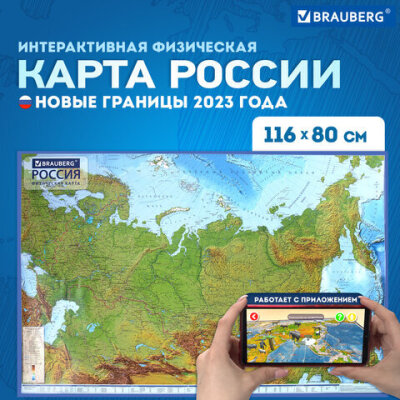 Карта России физическая 116х80 см, 1:7,5М, с ламинацией, интерактивная, европодвес, BRAUBERG, 112393