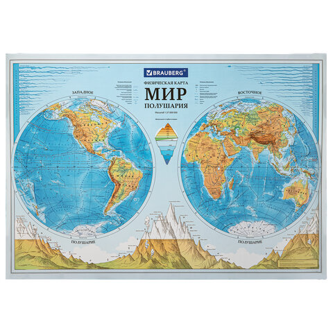 На физической карте мира "Полушария" BRAUBERG можно рассмотреть материки, моря и океаны, высочайшие вершины мира.