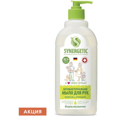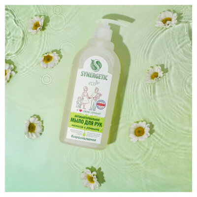 • Жидкое мыло SYNERGETIC «Мелисса и ромашка». Подходит для бережного очищения кожи рук и тела. Эффективно устраняет запахи и загрязнения даже в холодной воде. Обладает антибактериальным действием за счет синергетической комбинации мягких растительных масел.
