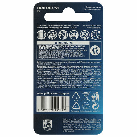Батарейки литиевые PHILIPS Lithium CR2032 "таблетки, дисковые, кнопочные" КОМПЛЕКТ 2 шт., блистер, Б0062716