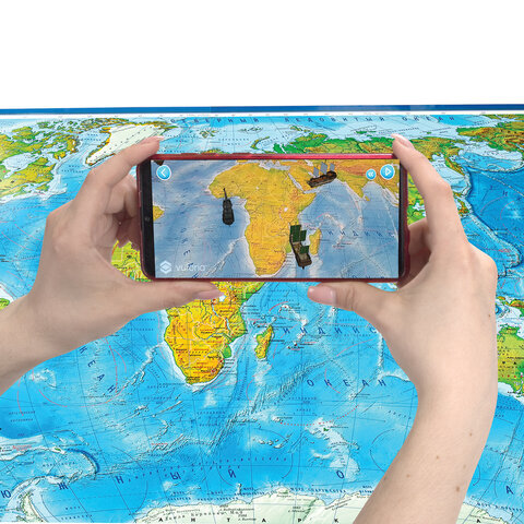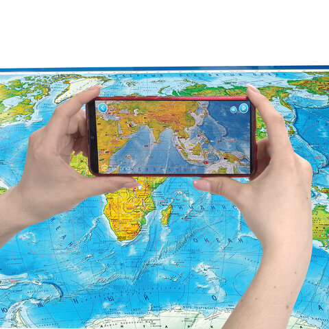 Карта мира физическая 199х134 см, 1:15,5М, с ламинацией, интерактивная, в тубусе, BRAUBERG, 112389