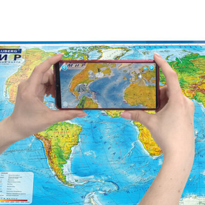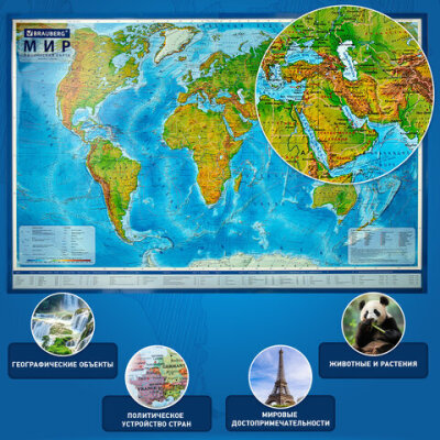 • На географической карте мира BRAUBERG отображаются названия континентов, океанов и морей, рек, гор, течений.