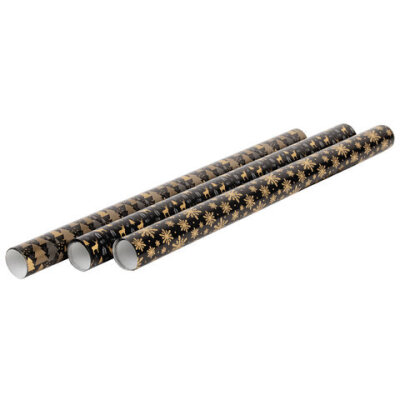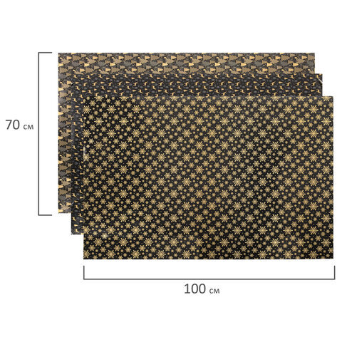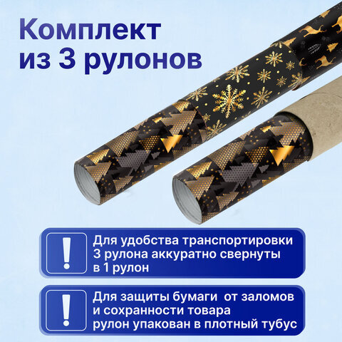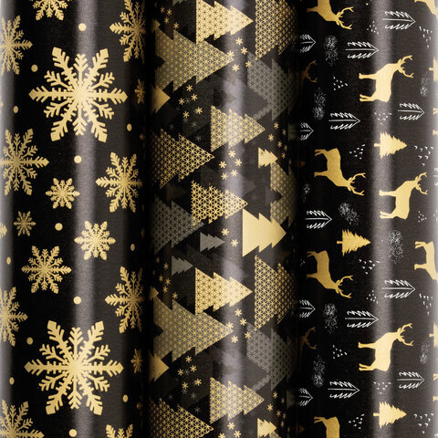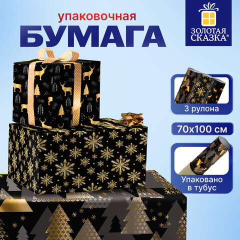 Бумага упаковочная новогодняя НАБОР 3 шт., "Black&Gold", 70х100 см, 3 дизайна, ЗОЛОТАЯ СКАЗКА, 592059