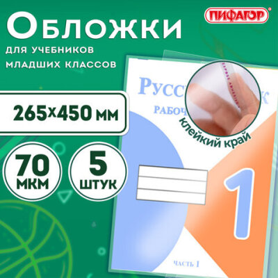 Обложки ПП для учебников младших классов БОЛЬШОГО ФОРМАТА, КОМПЛЕКТ 5 шт., КЛЕЙКИЙ КРАЙ, 70 мкм, 265х450 мм, прозрачные, ПИФАГОР, 227415
