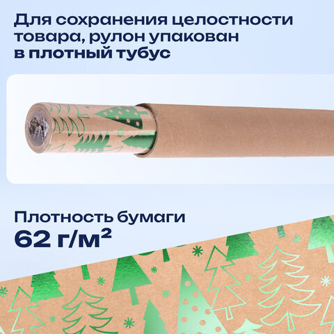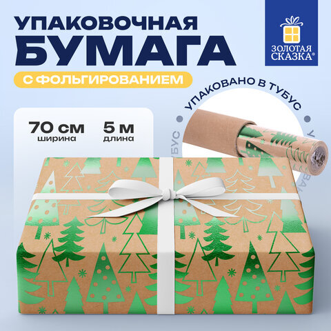 Бумага упаковочная подарочная крафт С ЭФФЕКТАМИ BIG SIZE новогодняя "Green Trees", 0,7х5 м, ЗОЛОТАЯ СКАЗКА, 591950