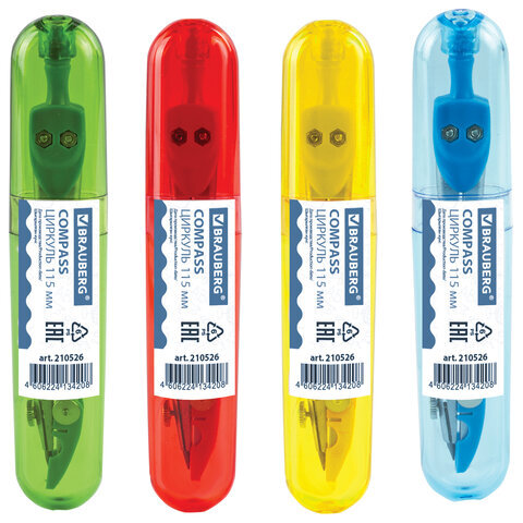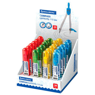 Циркуль с защитным колпачком BRAUBERG "Klasse", 115 мм, пластиковый пенал, ассорти, дисплей, 210526