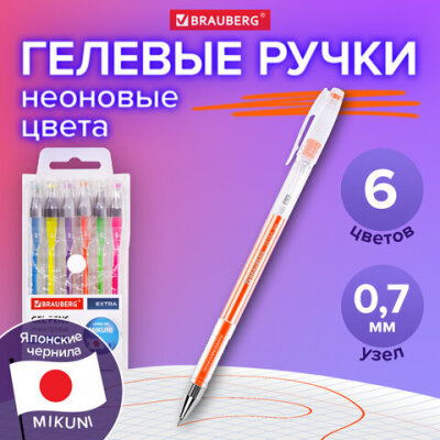 Ручки гелевые НЕОН BRAUBERG "EXTRA", НАБОР 6 ЦВЕТОВ, узел 0,7 мм, линия 0,5 мм, 143911