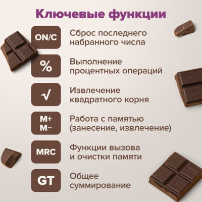 | Функционал | вычисление с памятью, извлечение квадратного корня, общее суммирование (GT), расчет процентов, сложение, вычитание, деление, умножение |