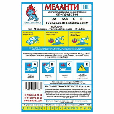 | Огнетушащая способность | 55В/2А |