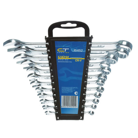 Набор гаечных ключей комбинированных 6-22 мм, 12 шт., CrV, хромированные, держатель с подвесом, 15452