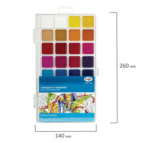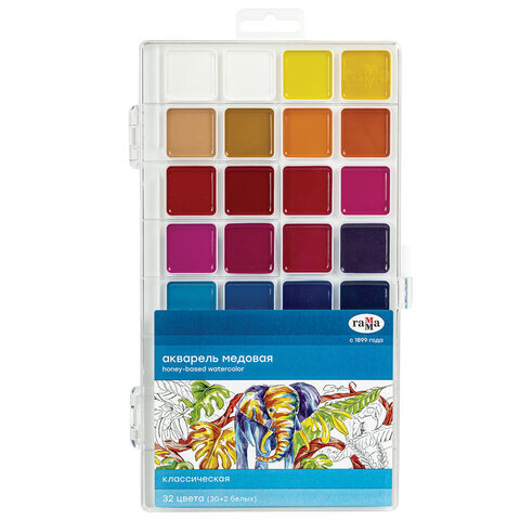 Краски акварельные ГАММА "Классическая", 32 цвета, медовая, пластиковая коробка, европодвес, 1009199