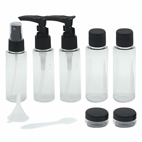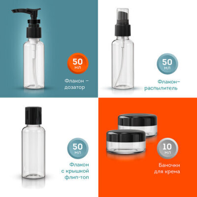 | Типы флаконов в наборе | баночка для крема, флакон с крышкой флип-топ, флакон-дозатор, флакон-распылитель |