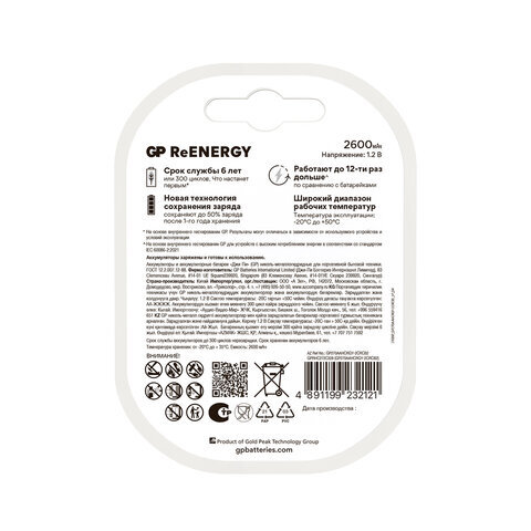 Батарейки аккумуляторные GP ReEnergy Ni-Mh пальчиковые КОМПЛЕКТ 2 шт., АА (HR6), 2600 mAh, 270AAHCRGY, 270AAHCRGY-2CR