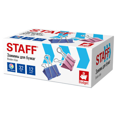 Зажимы для бумаг STAFF ECO, КОМПЛЕКТ 12 шт., 32 мм, на 140 листов, цветные, картонная коробка, 274039