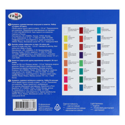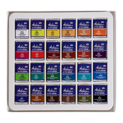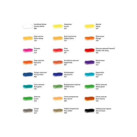 | Цвет | алый, английский красный, бирюзовый, виридоновый зеленый, желто-зеленый, желтый, зеленый, китайский белый, краплак красный темный, лазурь железная, лимонный, нейтрально-черный, оранжевый, охра желтая, охра золотистая, охра красная, розовый, сепия, сиена жженая, сиена натуральная, сине-зеленый, ультрамарин, умбра натуральная, фиолетовый |
