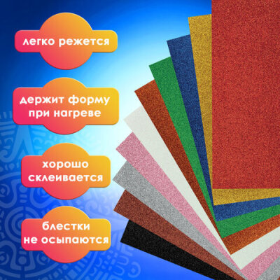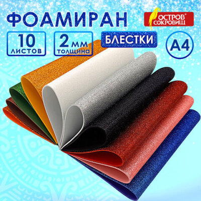 Пористая резина/фоамиран А4, 2 мм, НАБОР, 10 листов, 10 цветов, яркие цвета, блестки, ОСТРОВ СОКРОВИЩ, 665100