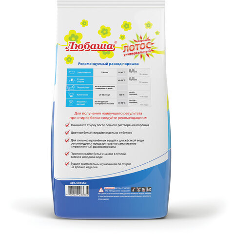 • Стиральный порошок для стирки в автоматических стиральных машинах ЛЮБАША - современное решение, позволяющее экономить собственное время и затраты воды. Подходит для замачивания и стирки изделий из хлопчатобумажных, льняных и синтетических волокон.