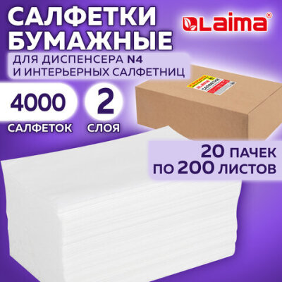 Салфетки бумажные для диспенсера (N4), LAIMA PREMIUM, КОМПЛЕКТ 20 пачек по 200 шт., 21х16,5 см, 2-слойные, 115502