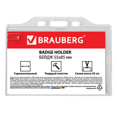 Бейдж горизонтальный (55х85 мм), на синей ленте 45 см, твердый пластик, BRAUBERG, 232138