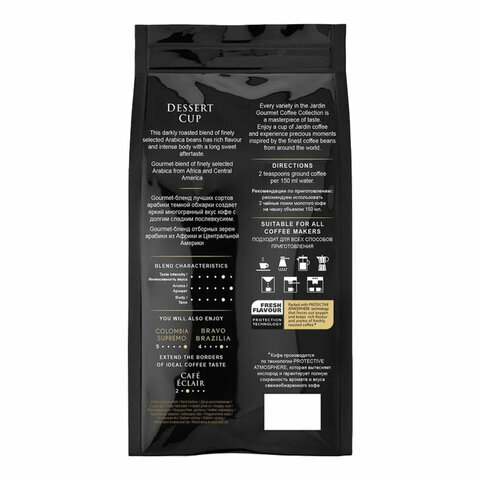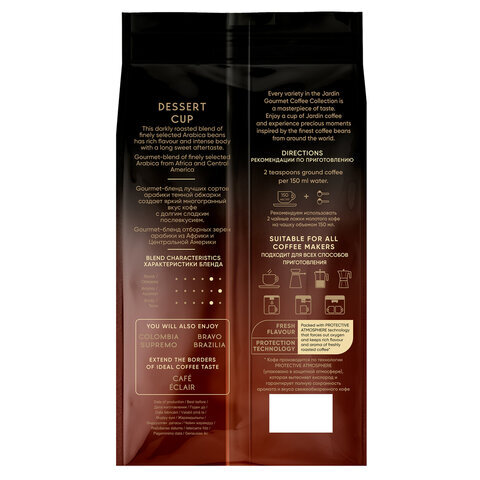 Тщательно выверенное сочетание зерен арабики из Африки и Центральной Америки и темная обжарка создают плотный насыщенный вкус кофе JARDIN "Dessert Cup" с деликатной фруктовой кислинкой и долгое послевкусие, наполненное сладостью великолепного десерта.