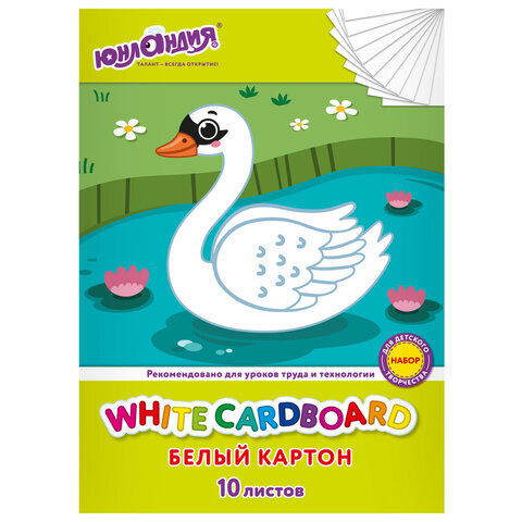 Картон белый А4 немелованный, 10 листов, в папке, ЮНЛАНДИЯ, 200х290 мм, "Лебедь", 115639