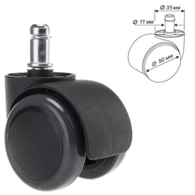Комплект роликов для офисных кресел. Стандартный размер штока – 11х21 мм. Максимальная нагрузка – 45 кг на 1 колесо. Полиуретановое покрытие обеспечивает бесшумный ход и защищает пол от повреждений. Рекомендованы для ламината, паркета, плитки, линолеума.