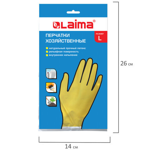 • Хозяйственные латексные перчатки LAIMA "Стандарт" защищают руки от воздействия грязи, влаги, моющих и чистящих средств при любых бытовых и хозяйственных работах: мытьё посуды, стирка белья, уборка, садоводческая работа и т.д.