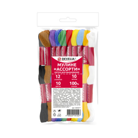 • Нитки мулине DEVELIA произведены из 100% хлопка высокого качества, предназначены для разных техник вышивания и плетения. Стойкие цвета не теряют насыщенности и блеска, долго сохраняя свою декоративность.