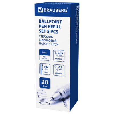 Стержни шариковые BRAUBERG, НАБОР 5 шт., 107 мм, СИНИЕ, узел 0,7 мм, линия письма 0,35 мм, 170192