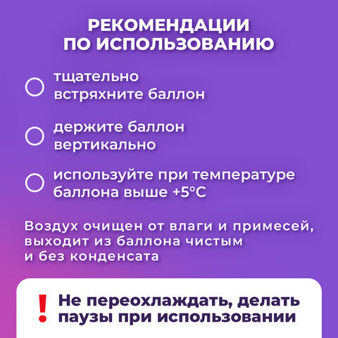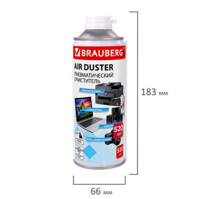 Баллон со сжатым воздухом BRAUBERG предназначен для бесконтактного удаления пыли и мелкого мусора из труднодоступных мест и внутреннего пространства компьютерной техники, аудио-, видео- и фотоаппаратуры, офисной и бытовой техники.