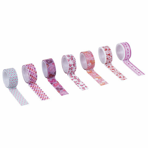 Клейкие WASHI-ленты для декора "СЕРДЦА", 15 мм х 3 м, 7 цветов, рисовая бумага, ОСТРОВ СОКРОВИЩ, 661708