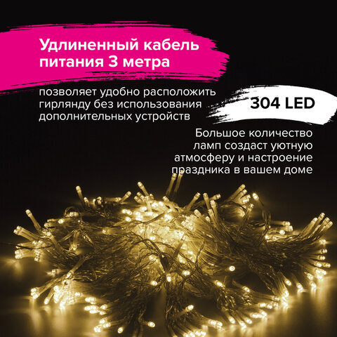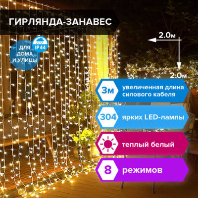 Электрогирлянда-занавес уличная "Штора" 2х2 м, 304 LED, теплый белый, 220 V, контроллер, ЗОЛОТАЯ СКАЗКА, 591301