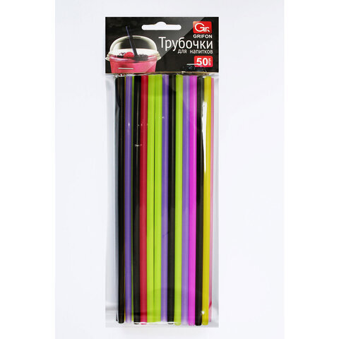 Трубочки для коктейлей прямые пластиковые 5х240 мм, цветные, КОМПЛЕКТ 50 шт., GRIFON, 105-139
