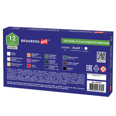 • Сухая художественная пастель BRAUBERG ART "CLASSIC" предназначена для графики и живописи. Она отличается насыщенностью цвета, мягким письмом и не крошится при использовании. Пастель подходит как для начинающих художников и любителей, так и профессионалов.