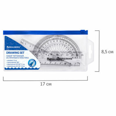 Набор чертежный малый BRAUBERG (линейка 15 см, 2 угольника, транспортир), конверт на молнии, 210306