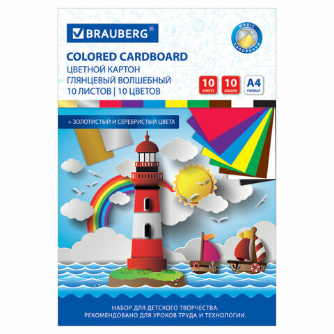 Картон цветной А4 МЕЛОВАННЫЙ (глянцевый), ВОЛШЕБНЫЙ, 10 листов, 10 цветов, в папке, BRAUBERG, 200х290 мм, "Маяк", 129915