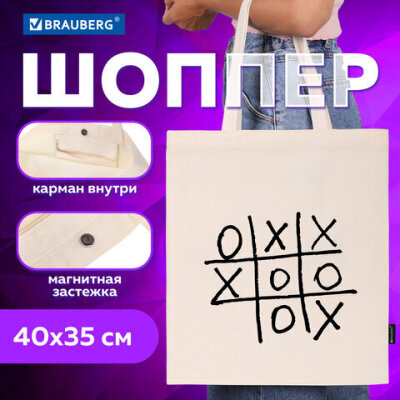 Сумка шоппер BRAUBERG PREMIUM, канвас, 40х35 см, на кнопке, карман, бежевый, "Tic-tac-toe", 271902