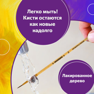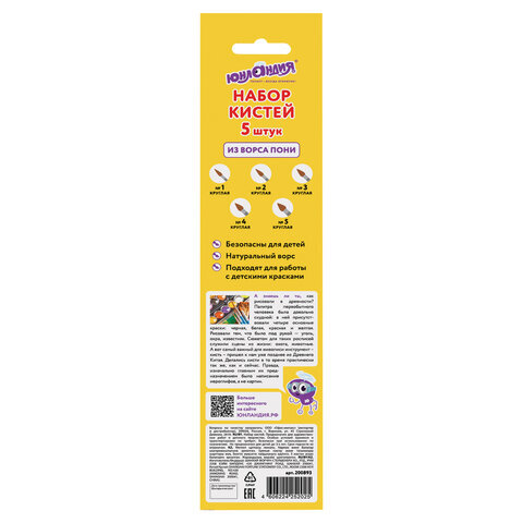 Набор из пяти кистей разного размера ЮНЛАНДИЯ позволяет начинающим художникам решать любые творческие задачи в детском саду, школе и дома.