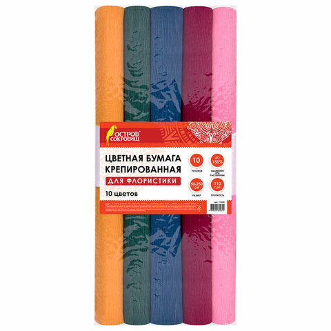 Бумага гофрированная/креповая, 110 г/м2, 50х250 см, НАБОР 10 рулонов, интенсив, ОСТРОВ СОКРОВИЩ, 112555