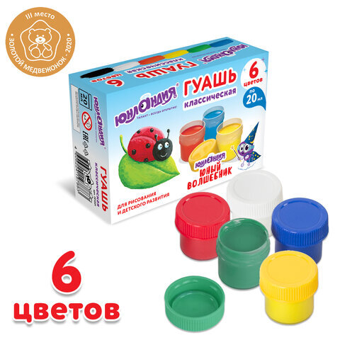 Гуашь ЮНЛАНДИЯ "ЮНЫЙ ВОЛШЕБНИК", 6 цветов по 20 мл, высшее качество, 191331