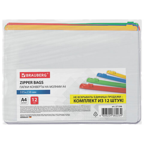 Папка-конверт СУПЕР КОМПЛЕКТ на молнии, 12 штук, А4 (335х238 мм), BRAUBERG, 271346