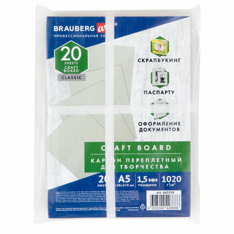 Картон переплетный, толщина 1,5 мм, А5 (148х210 мм), КОМПЛЕКТ 20 шт., BRAUBERG ART, 665558