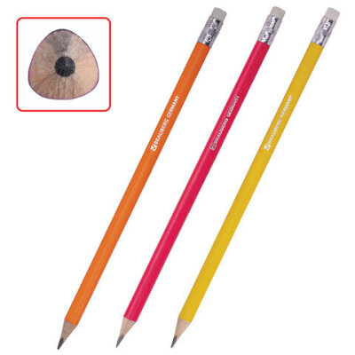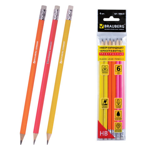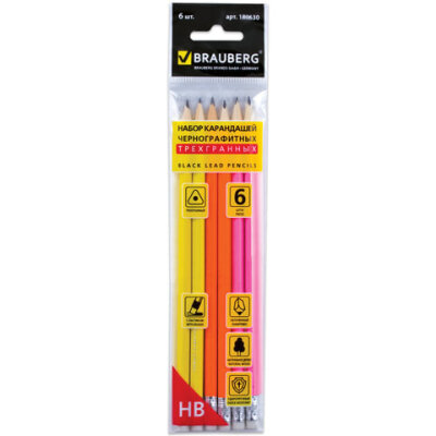 Карандаши чернографитные BRAUBERG НАБОР 6 шт., НВ, трехгранные, с резинкой, корпус ассорти, заточенные, 180630