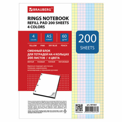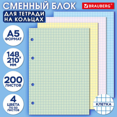 Сменный блок для тетради на кольцах, А5, 200 л., BRAUBERG, 4 цвета по 50 листов, 401661