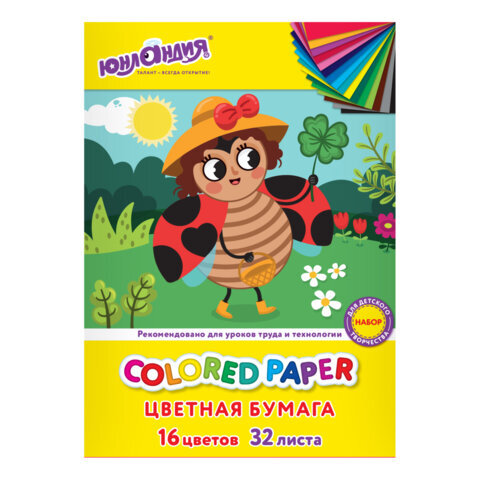 Цветная бумага А4 офсетная, 32 л., 16 цветов, на скобе, ЮНЛАНДИЯ, 200х280 мм, Божья коровка, 115638